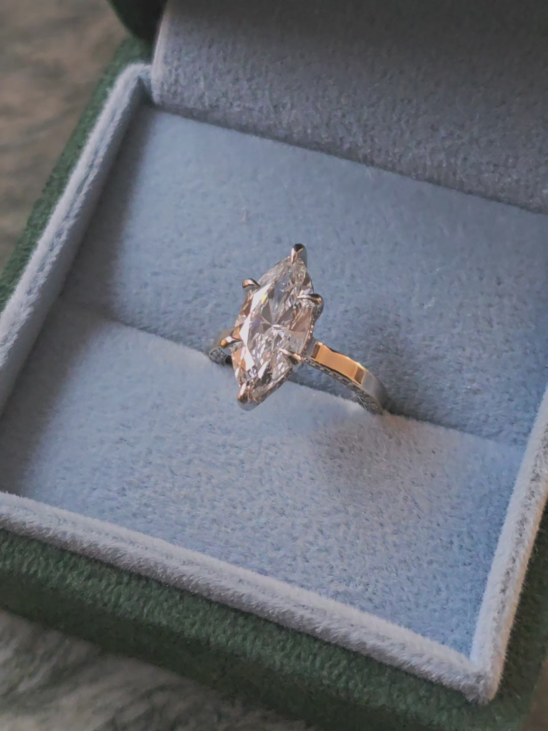 Starting at $7,500 CAD plus tax, inclusive of a 2ct lab-created EF VS cushion set in 14kt gold.